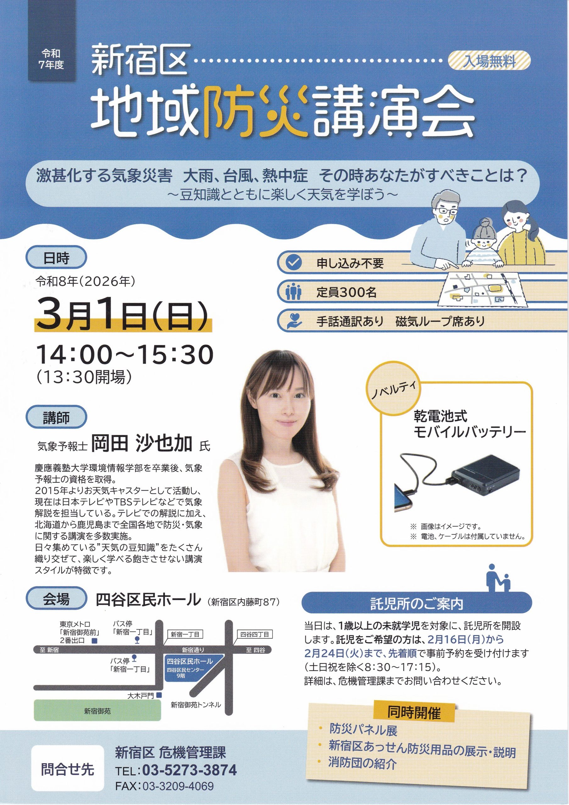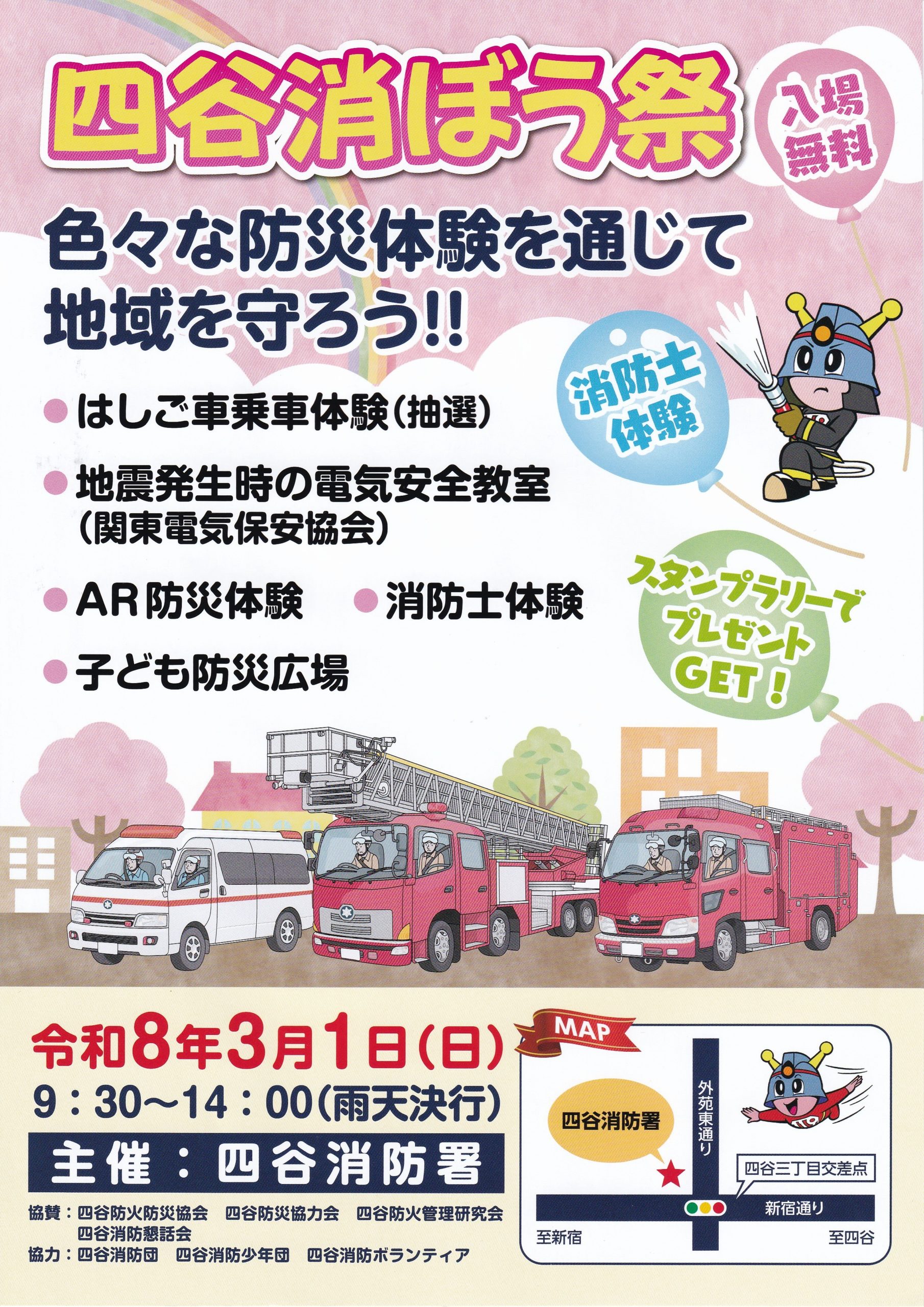 色々な防災体験を通じて地域を守ろう!! 令和8年3月1日(日) 9:30~14:00(雨天決行) 四谷消防署 ○はしご車乗車体験(抽選)○地震発生時の電気安全教室(関東電気保安協会)○AR防災体験○消防士体験○子ども防災 ...