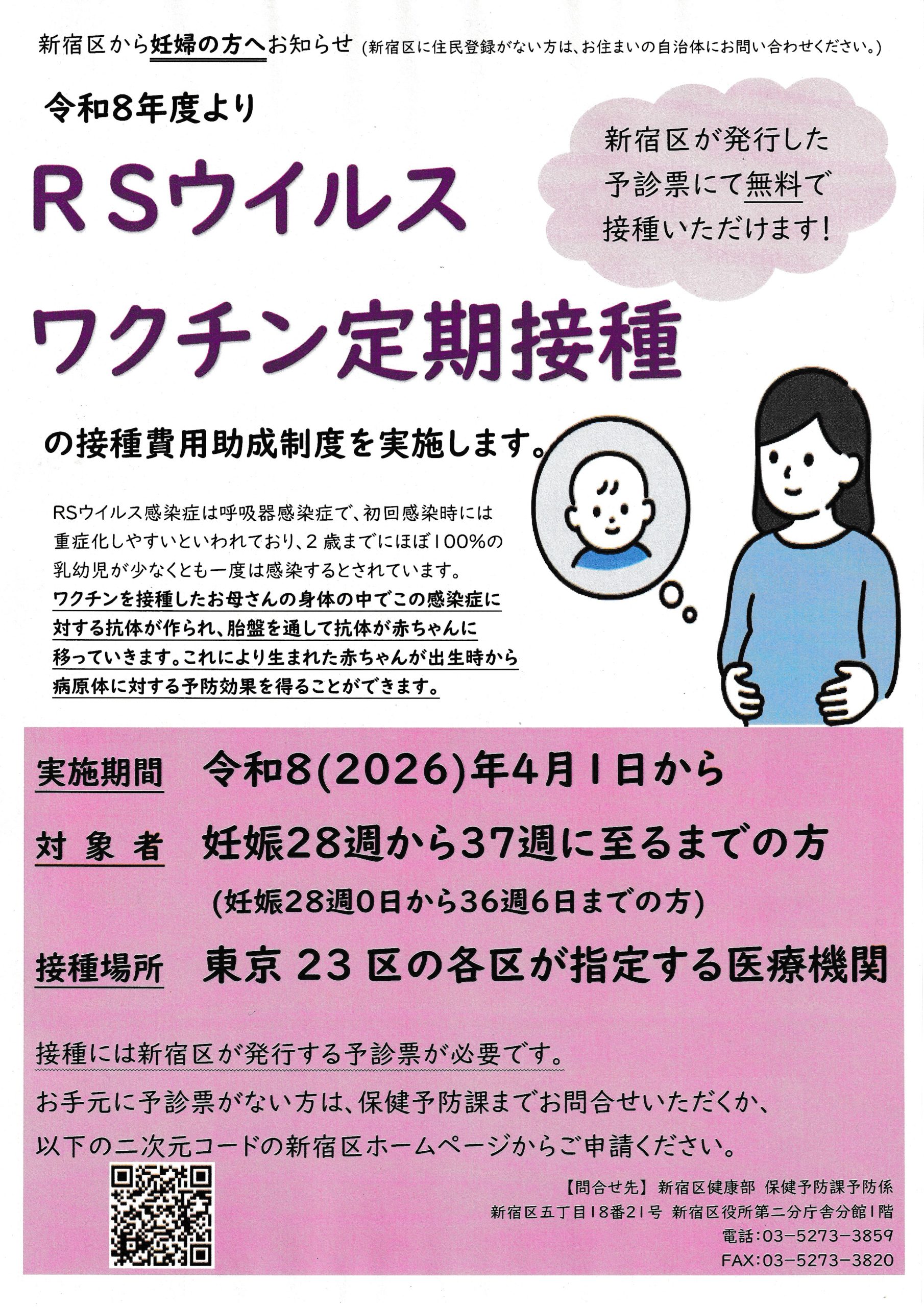 実施期間 令和8(2026)年4月1日から対象者 妊娠28週から37週に至るまでの方(妊娠28週0日から36週6日までの方)接種場所 東京23区の各区が指定する医療機関 接種には新宿区が発行する予診票が必要です。 WE ...