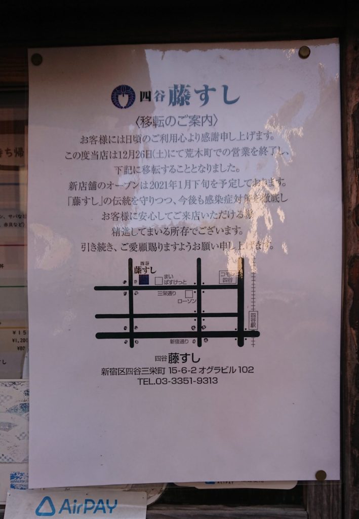 歯医者に行く途中、杉大門通りを通りかかると藤すしさんのお店の前に移転の告知が貼ってあったので、写真を撮ってきました。移転先は四谷三栄町15番6号のオグラビルの1階です。
