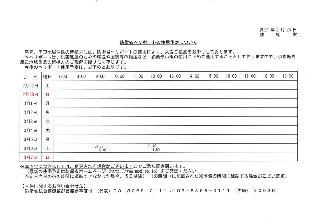 防衛省ヘリポートの使用予定について(2月27日~3月7日)