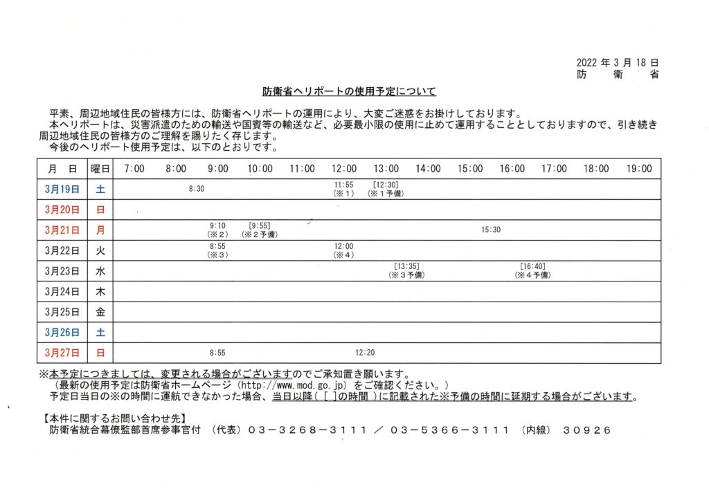 防衛省ヘリポートの使用予定について(3月19日~3月27日)