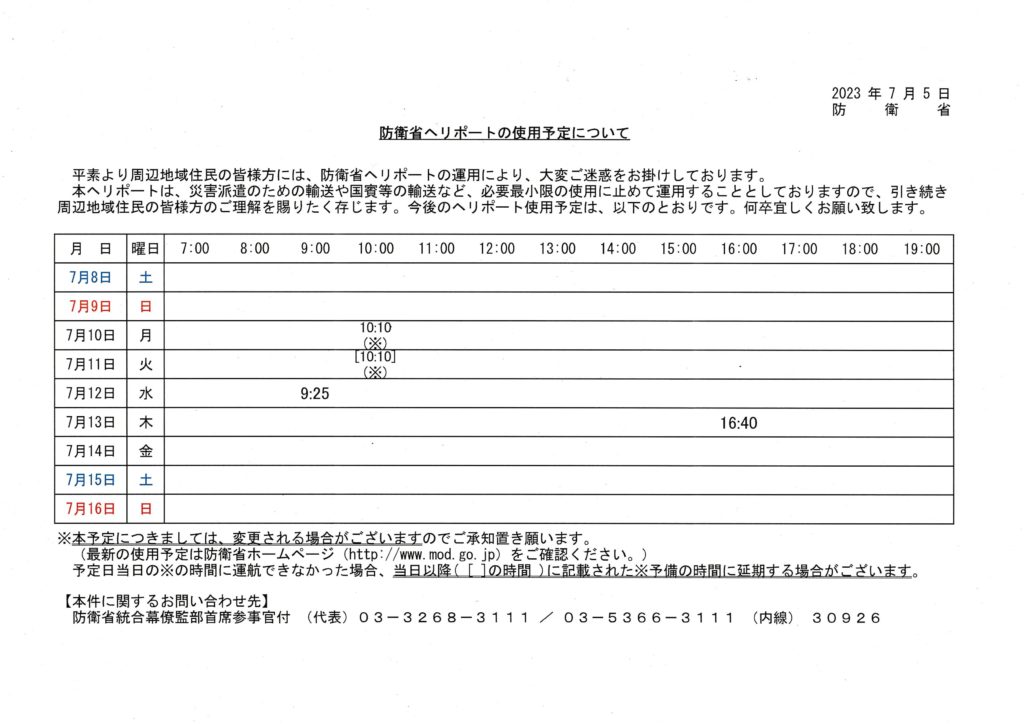 防衛省ヘリポートの使用予定について(2023年7月8日~7月16日)