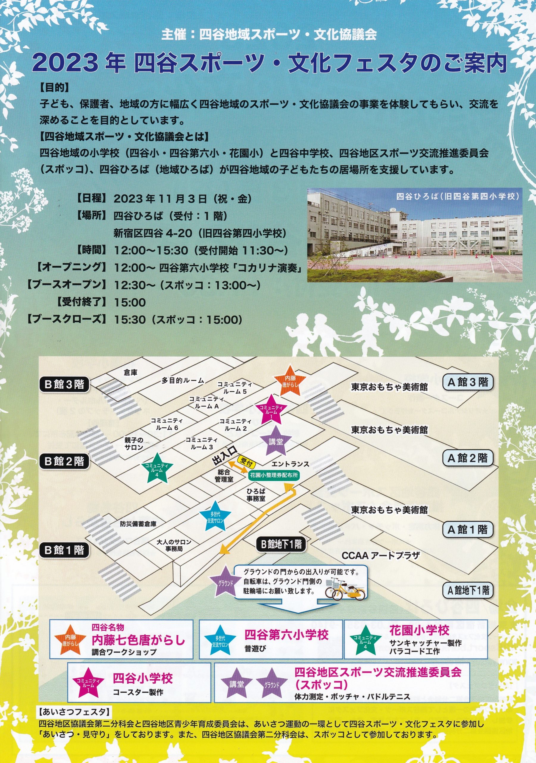 11月3日(祝) 12:00~15:301F受付:11:30~@四谷ひろば・四谷小学校 コースター製作・四谷第六小学校 昔遊び、射的・ベーゴマなど・花園小学校 サンキャッチャー製作、パラコード工作・四谷地区スポーツ交流推進委員会(スポッコ) 体力測定・ボッチャ・パドルテニス・四谷名物内藤七色唐がらし 調合ワークショップ