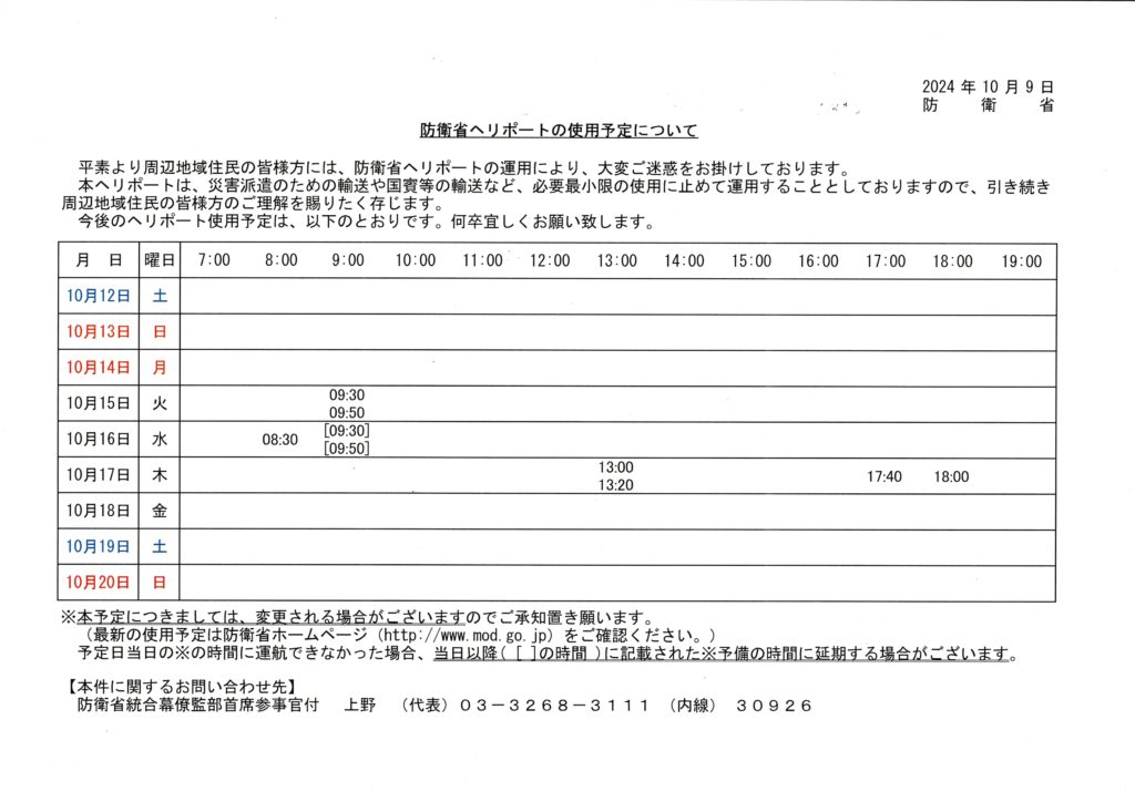 防衛省ヘリポートの使用予定について(2024年10月12日(土)~10月20日(日)