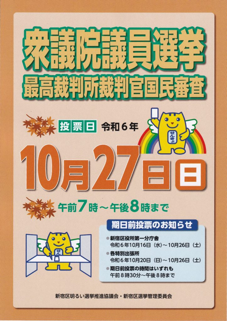 期日前投票のお知らせ●新宿役所第一分庁舎 令和6年10月16日(水)~10月26日(土)●各特別出張所 令和6年10月20日(日)~10月26日(土)●期日前投票の時間はいずれも 午前8時30分~午後8時まで