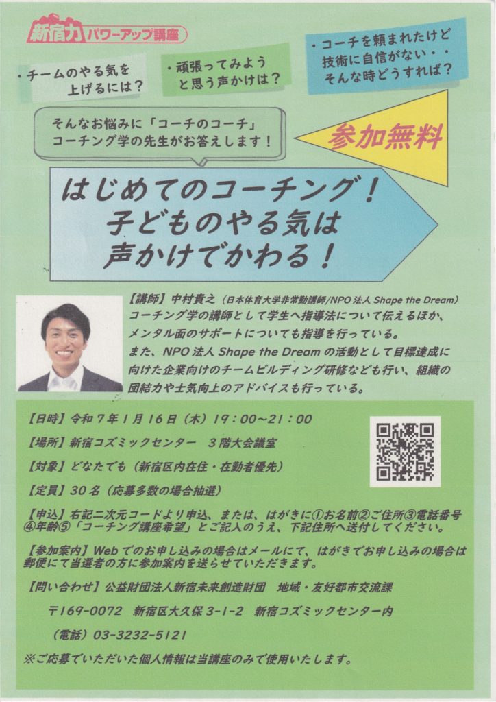【申込】https://www.regasu-shinjuku.or.jp/?p=200088から、または、はがきに➀お名前➁ご住所③電話番号④年齢⑤「コーチング講座希望」とご記入のうえ、下記住所へ送付してください。