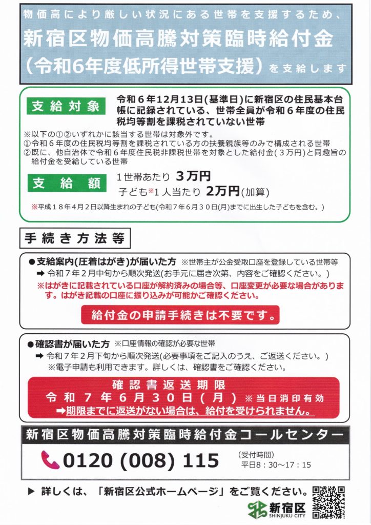 新宿区物価高騰対策臨時給付金【令和6年度低所得者世帯支援】