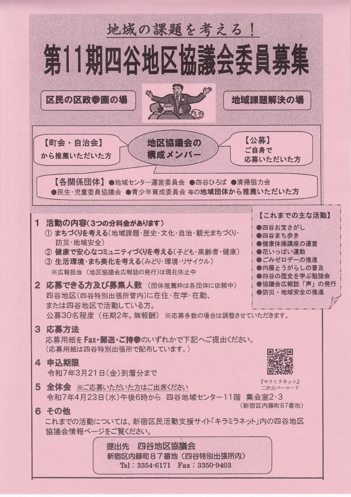応募方法 応募用紙をFax・郵送・持参のいずれかで四谷地区協議会(四谷特別出張所内)