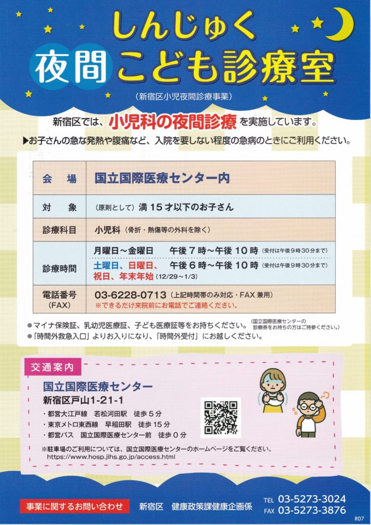 会 場 国立国際医療センター内対 象 (原則として)満15才以下のお子さん診療科目 小児科(骨折・熱傷等の外科を除く)診療時間 月曜日~金曜日 午後7時~午後10時(受付は午後9時30分まで) 土曜日、日曜日、祝日、年末年始(12/29~1/3) 午後7時~午後10時(受付は午後9時30分まで)