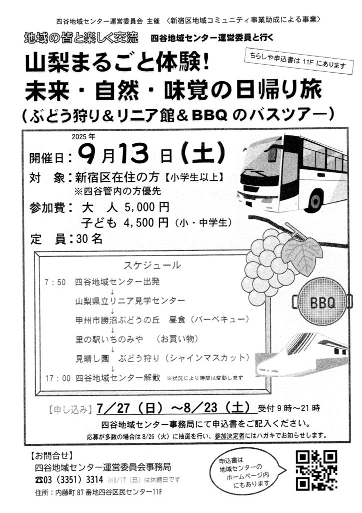 開催日:2025年9月13日(土)対 象:新宿区在住の方【小学生以上】 ※四谷管内の方優先参加費:大人5,000円 子ども4,500円(小・中学生)定 員:30名