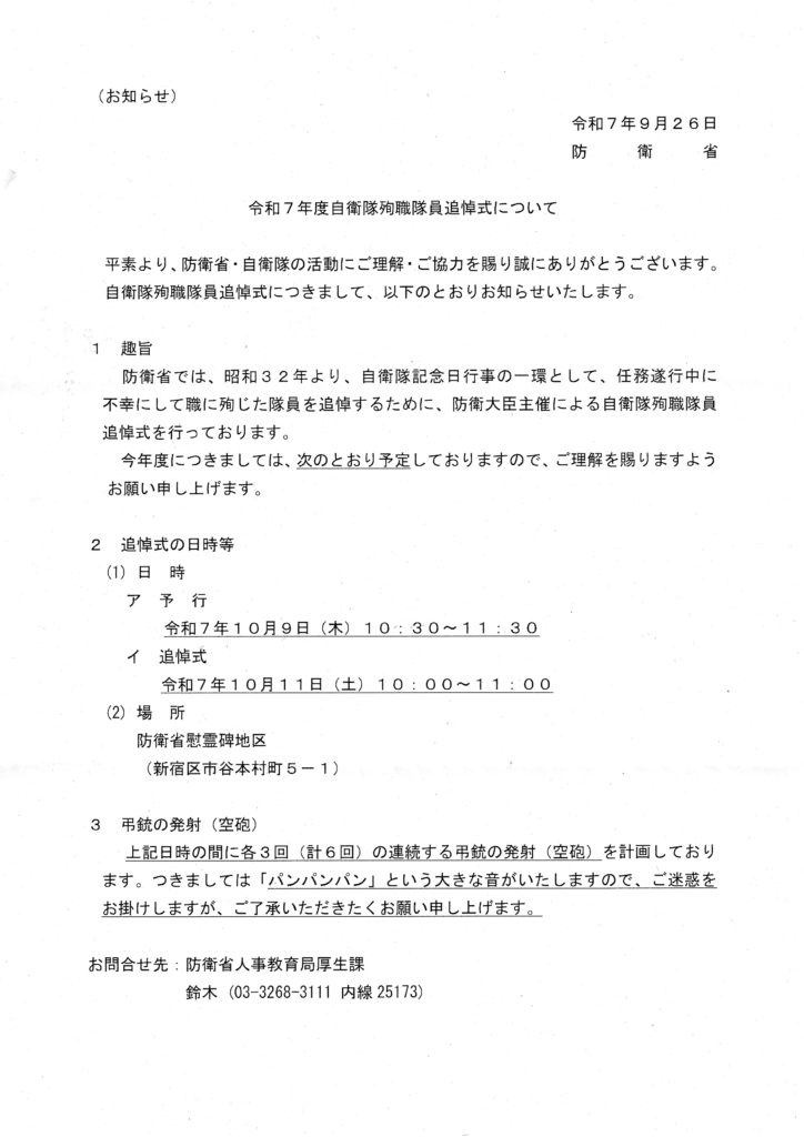 令和7年度自衛隊殉職隊員追悼式について