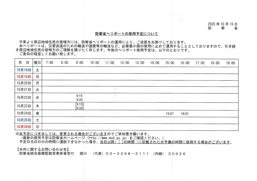 防衛省ヘリポートの使用予定について(2025年10月18日(土)~10月26日(日)