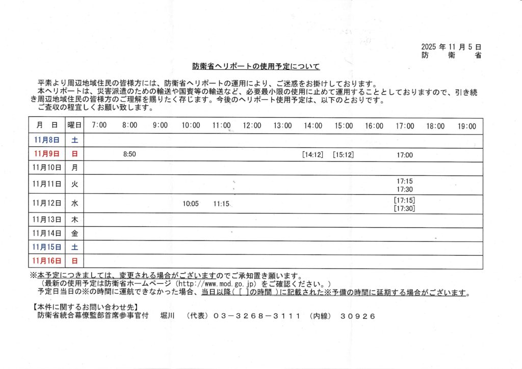 防衛省ヘリポートの使用予定について(2025年11月8日(土)~11月16日(日)
