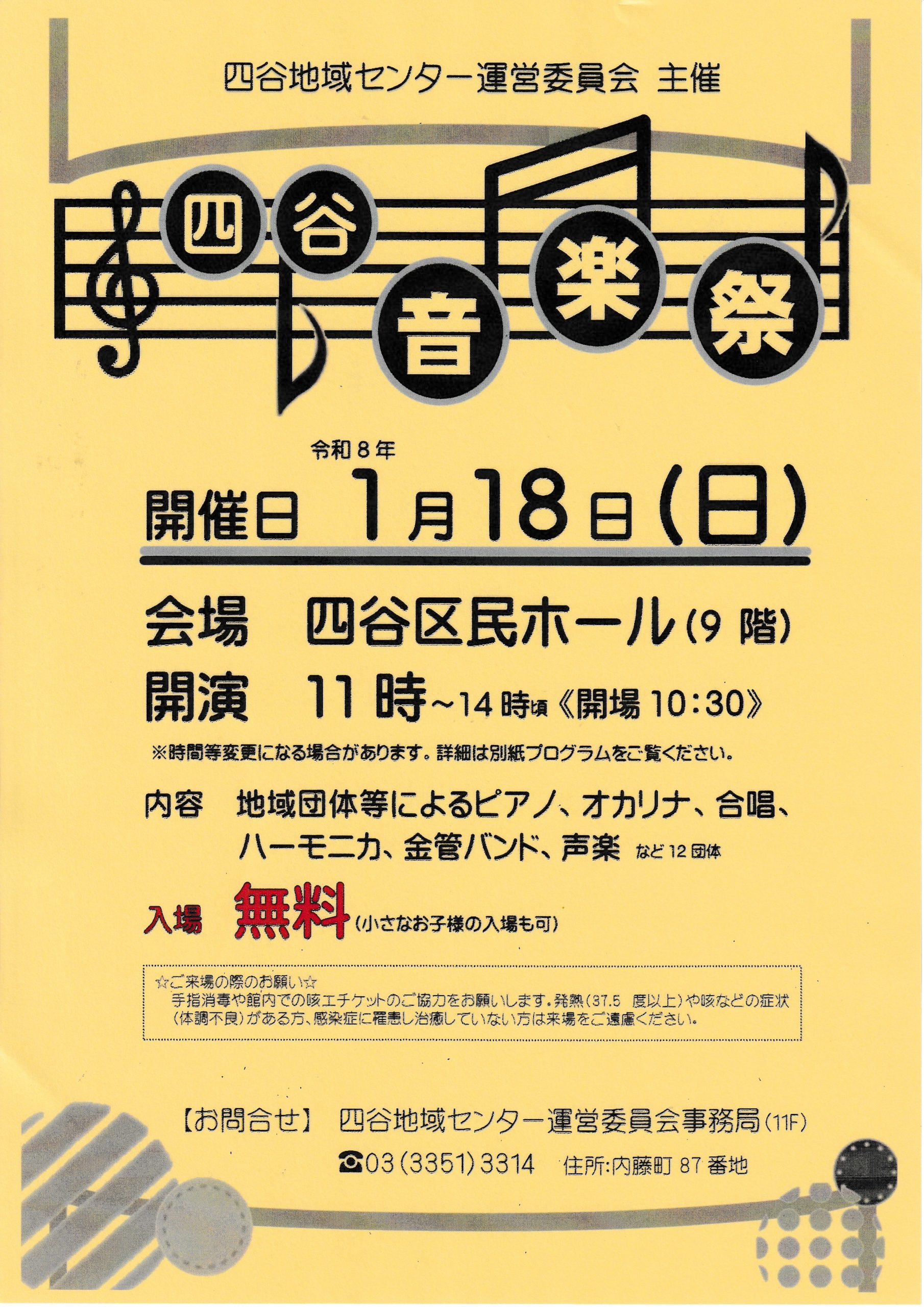 開催日 令和8年1月18日(日)会場 四谷区民ホール(9階)開演 11時~14時頃《開場10:30》内容 地域団体によるピアノ、オカリナ、合唱、ホーモニカ、金管バンド、声楽 など12団体入場 無料(小さなお子様の入場も可)
