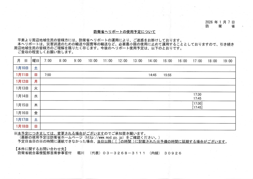 防衛省ヘリポートの使用予定について(2026年1月10日(土)~1月18日(日)