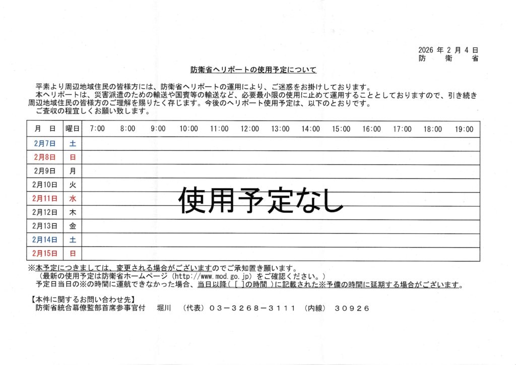 防衛省ヘリポートの使用予定について(2026年2月7日(土)~2月15日(日)