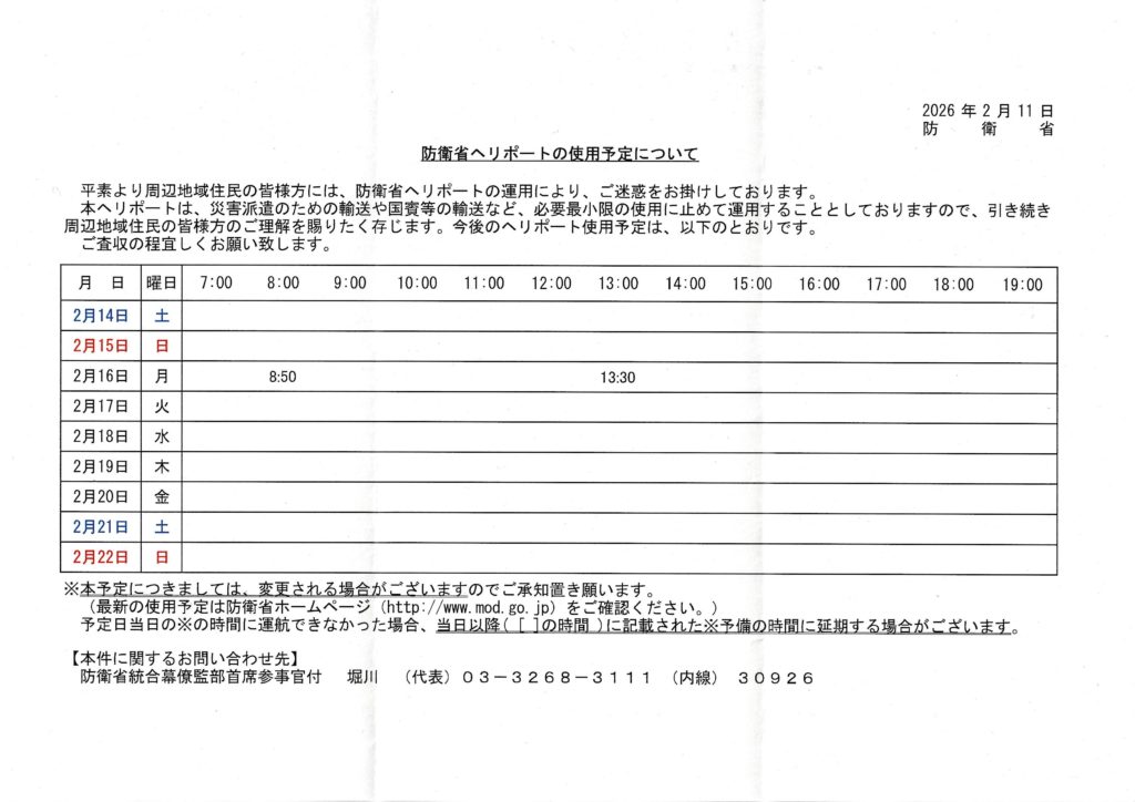 書類が郵送されてくるため、届くのが火曜日になる場合があります。それからこちらにアップロードするため火曜日午後~水曜日になってしまいますことご容赦ください。最新情報は https://www.mod.go.jp/j/profile/chouwa/heliport/index.html をご確認ください。