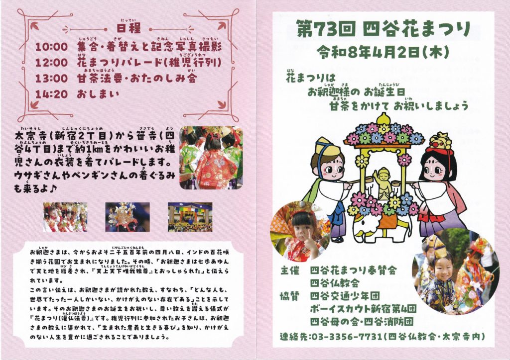 令和8年4月2日(木)花まつり稚児行列 12時 太宗寺出発灌 仏 法 要 13時 笹寺本堂