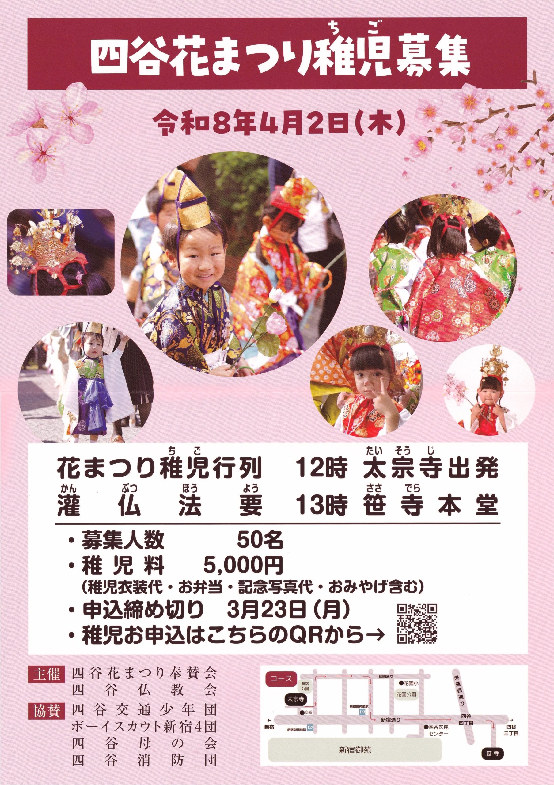 ・募集人数 50名・稚児料 5,000円(稚児衣装代・お弁当・記念写真代・おみやげ含む)・申込締め切り 3月23日(月)・稚児お申し込み 第73回四谷花まつり申し込みフォーム