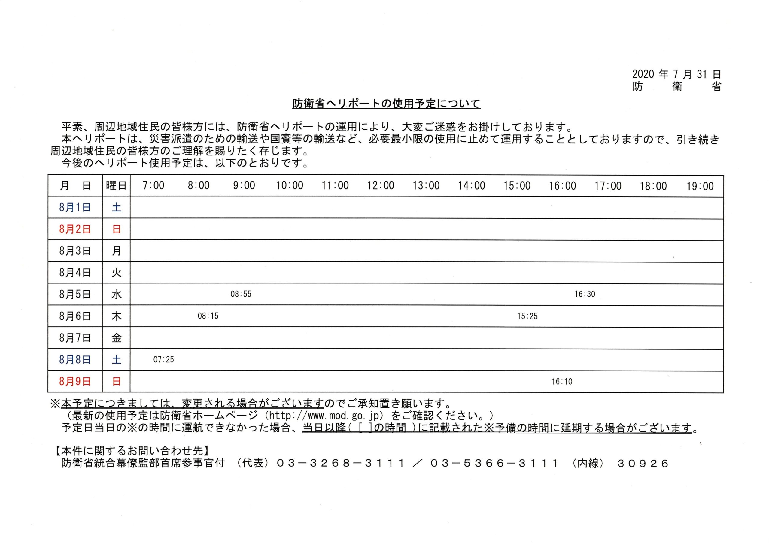 防衛省ヘリポートの使用予定について(8月1日~8月9日)